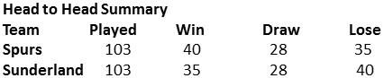 Last season, we played this fixture on the exact same date: September 13th. We drew the game 2-2, going ahead twice through Chadli and Eriksen before being pegged back twice, with the final equalizer being a Harry Kane own goal. We beat them 2-1 in the return fixture later in the season. The last time Sunderland beat us in the Premier League was back in 2010.