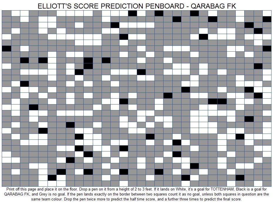 I rate the likelihood of us scoring as a huge 86%, of us scoring more than once as 52% and of us keeping a clean sheet as a massive 71%. The most likely scorelines are: a 2-0 win, a 1-0 win, a 3-0 win, and a 1-1 draw. Overall I have 73% for a Spurs win, 19% for a draw and 8% for a Qarabağ win.