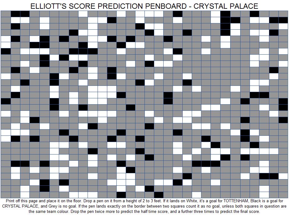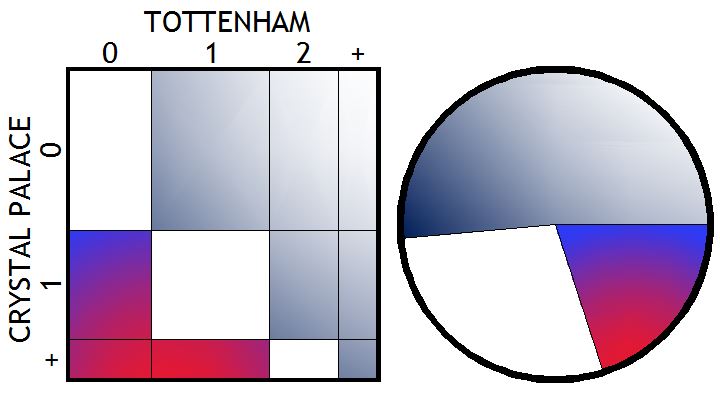 I rate the likelihood of us scoring as a nice 72%, of us scoring more than once as 32% and of us keeping a clean sheet as a respectable 53%. The most likely scorelines are: a 1-0 win, a 1-1 draw, a 2-0 win, and a 0-0 draw. Overall I have 51% for a Spurs win, 29% for a draw and 20% for a Palace win.