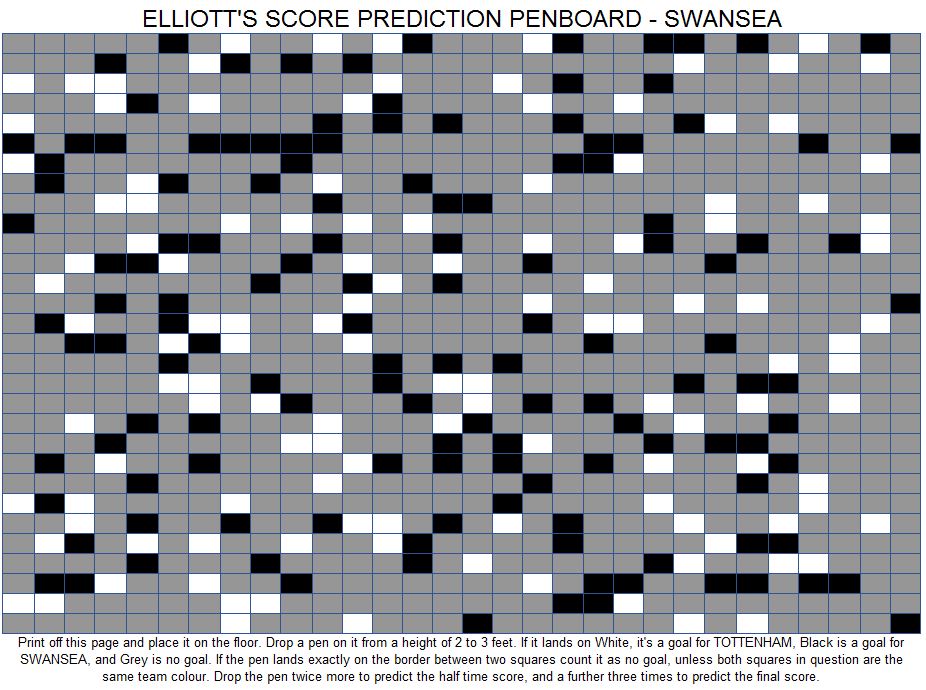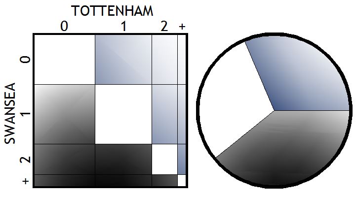 I rate the likelihood of us scoring as a respectable 59%, of us scoring more than once as 22% and of us keeping a clean sheet as a modest 34%. The most likely scorelines are: a 1-0 defeat, a 1-1 draw, a 1-0 win, and a 0-0 draw. Overall I have 31% for a Spurs win, 30% for a draw and 39% for a Swansea win.