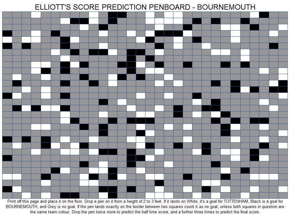 I think we have a 68% chance of scoring, a 28% chance of scoring more than once, and a 40% chance of keeping a clean sheet. The most likely scorelines are: a 1-1 draw, a 1-0 win, a 1-0 defeat, and a 2-0 win. Overall I have 41% for a Spurs win, 30% for a draw and 29% for a Bournemouth win.