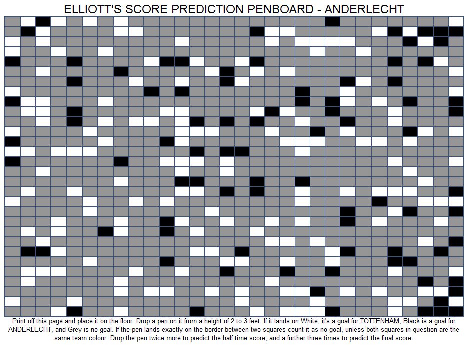 The most likely scorelines are: a 1-0 win, a 2-0 win, a 1-1 draw, and a 0-0 draw. Overall I think there is a 55% chance of a Spurs win, a 27% chance of a draw, and a 18% chance of an Anderlecht win.